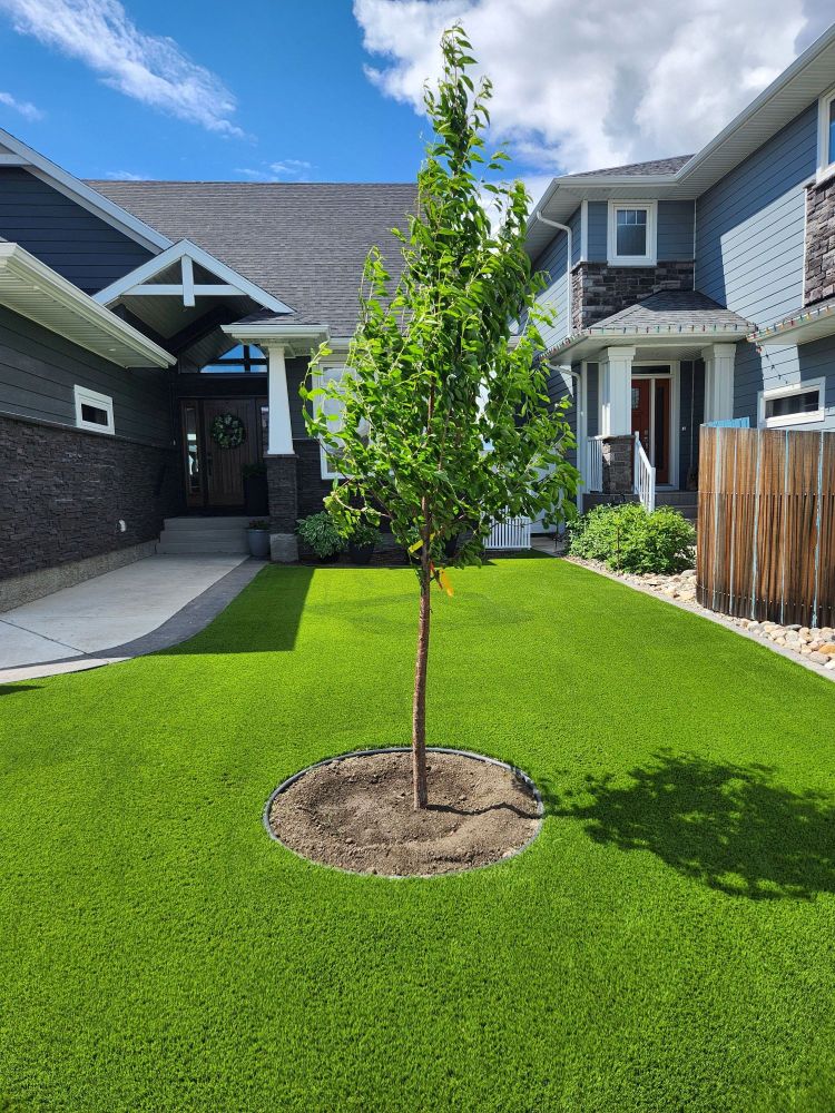 First we start by removing all your sod as well as up to 5 inches of dirt. Then we bring in a compactable base and reshape your space with a focus on a flat, level surface that moves water away. Then we lay down a commercial weed barrier, then cut and lay the artificial turf, and then we finish by laying a sand or silica infill to give the artificial turf body and height.